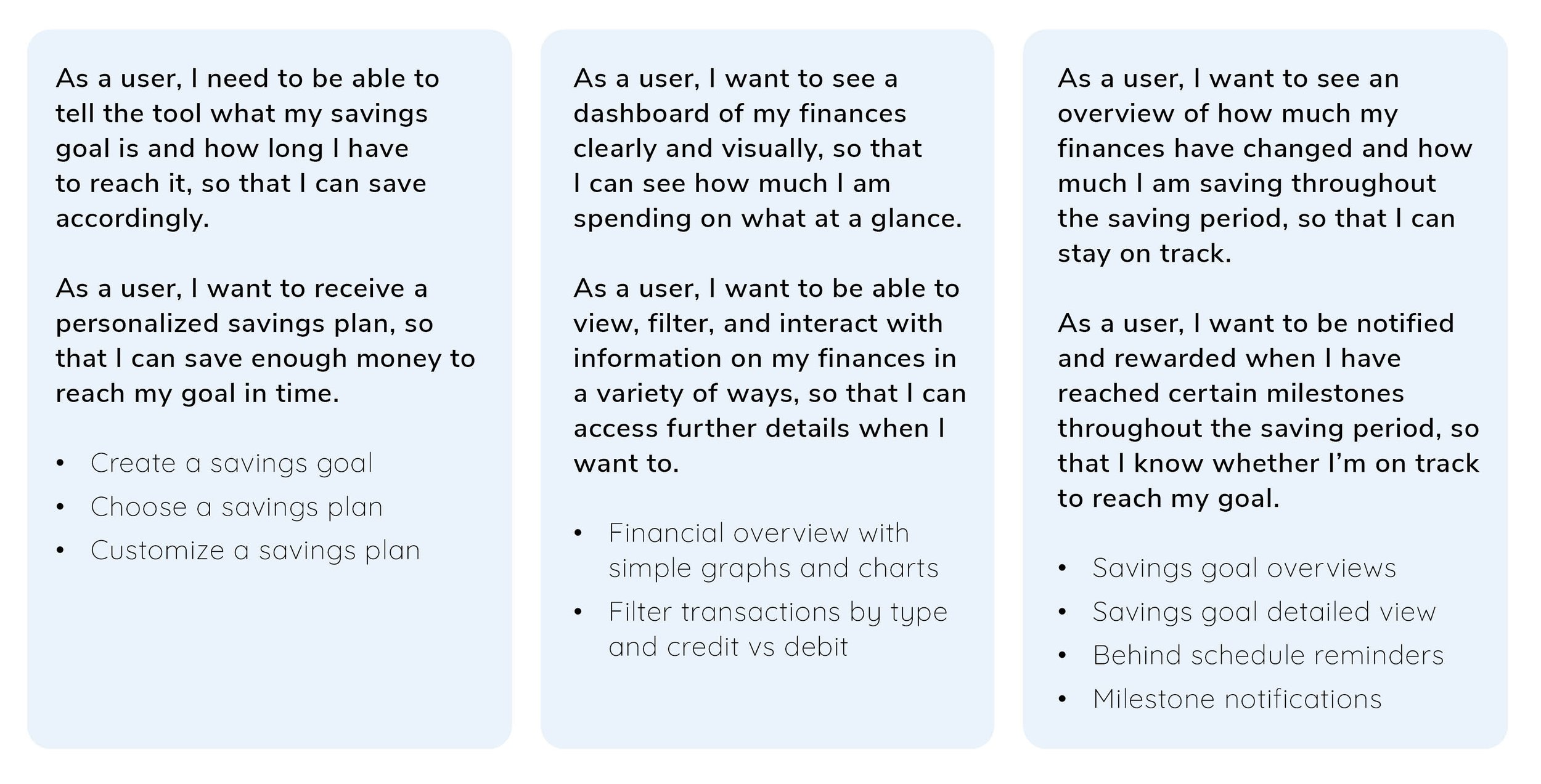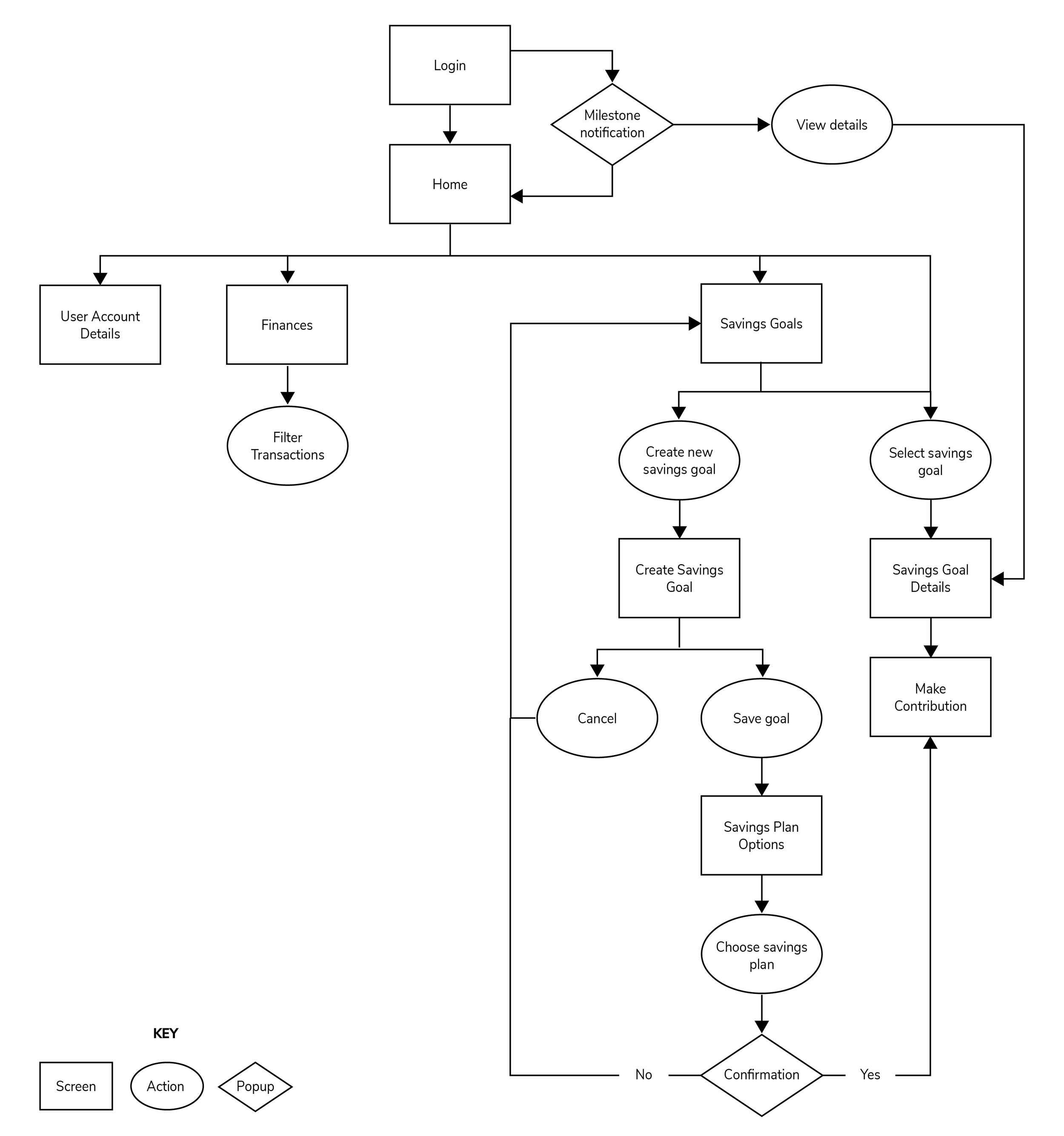 Using provided jobs to be done statements, I determined the minimum feature set for the app, which included financial and savings dashboards, personalized savings plans, and filtering options for financial data and transactions. I designed user flows for each feature, then combined them to create an overall user flow diagram.